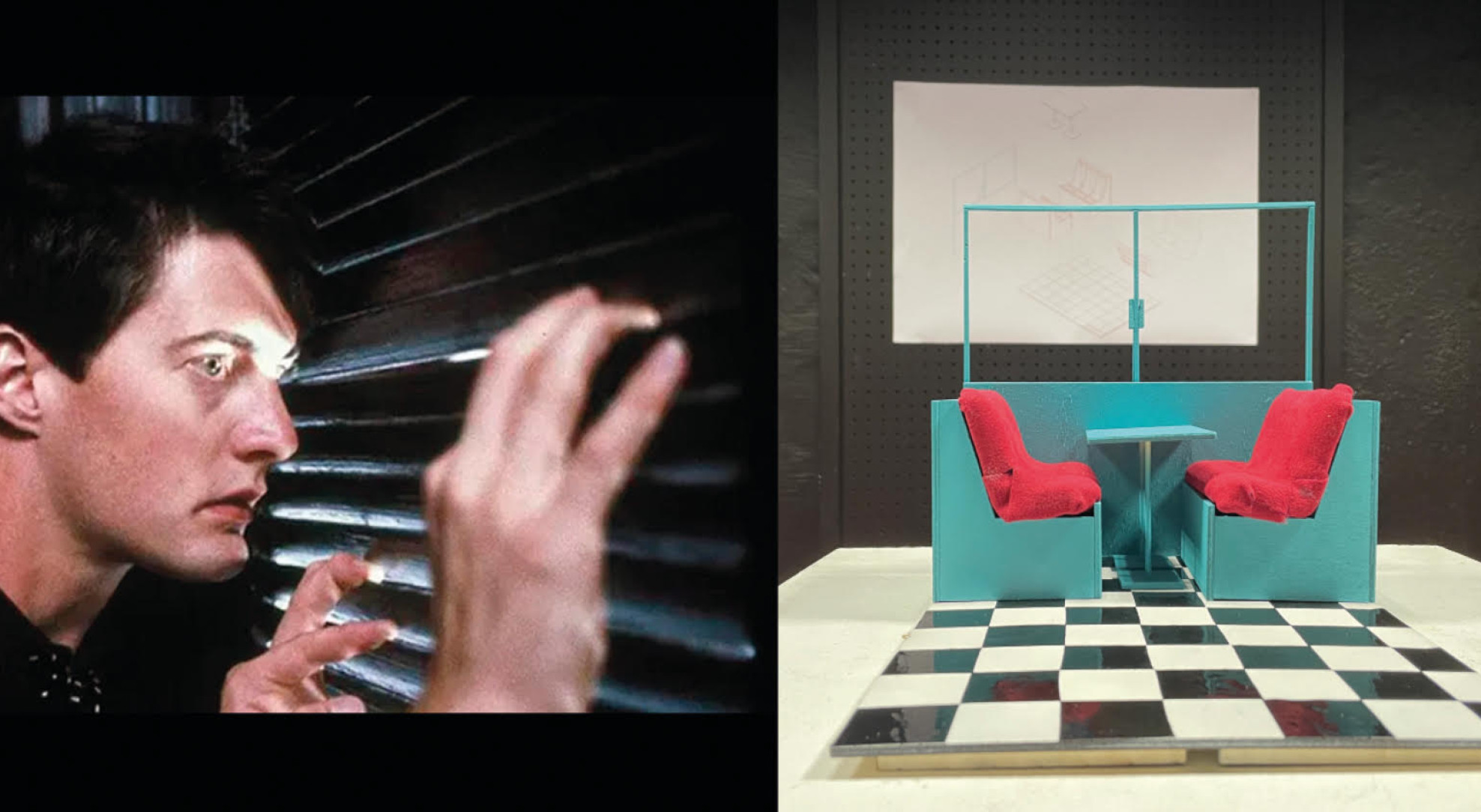 In tribute to David Lynch, who passed away on January 15, 2025, and under the educational supervision of architect Charles Poulain and art and architecture critic Christophe Le Gac, two groups of students from the Design program at TALM-Angers were tasked with crystallizing the essence of David Lynch's cinema in a set design. Two sets were created: a “diner,” the quintessential Lynchian setting, and one of the cult scenes from Blue Velvet, where Frank visits Dorothy while she is with Jeffrey. The latter is forced to take refuge in the closet with louvered doors, becoming the voyeuristic viewer's accomplice. The result is a “voyeuristic” installation.